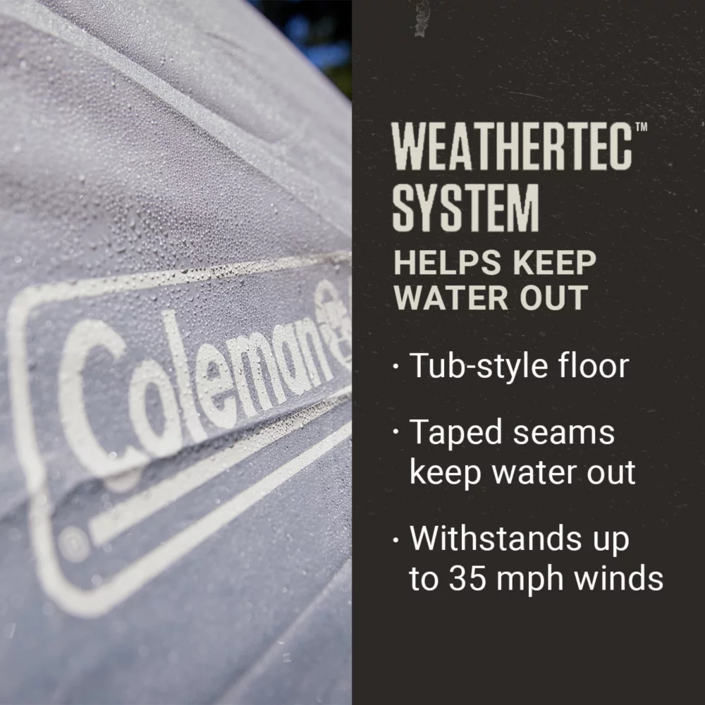 - WEATHERTEC™ PROTECTION: Tub-like floor, welded corners, inverted seams and taped seams on the rainfly and tent body help keep water out; frame has been tested to withstand winds up to 35 mph